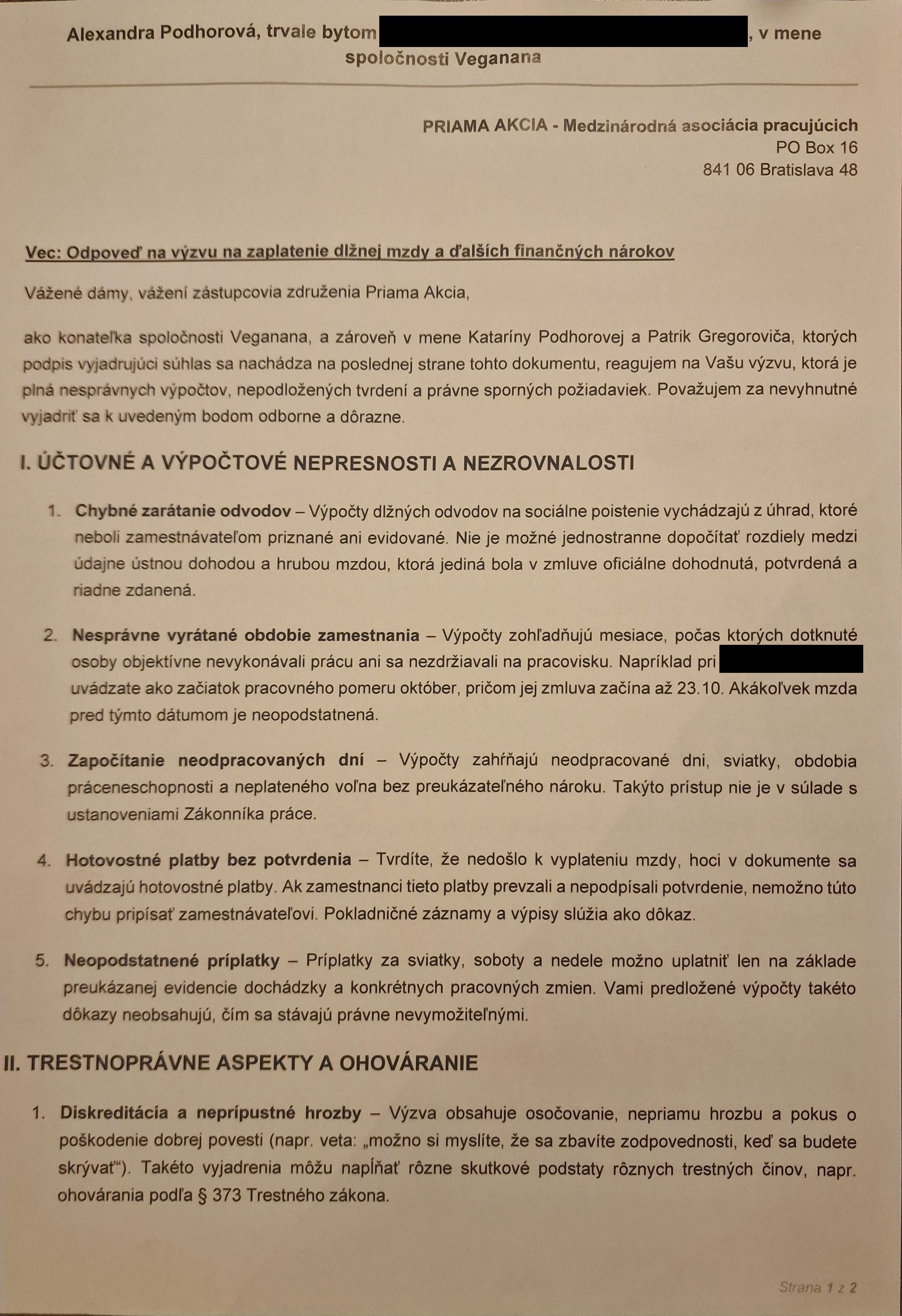 V úvodných bodoch svojho listu z 22. mája 2025 prezentujete údajné nepresnosti a nezrovnalosti vo výpočtoch. Vaše príklady však v skutočnosti súvisia s chybami na strane zamestnávateľa a obsiahlo sme sa k nim vyjadrili ešte v polovici septembra 2024 v nasledujúcom texte: https://priamaakcia.sk/VegaNana-nadalej-odmieta-vyplatit-dlzne-mzdy-a-zavadza-verejnost-A-teraz-fakty.html.