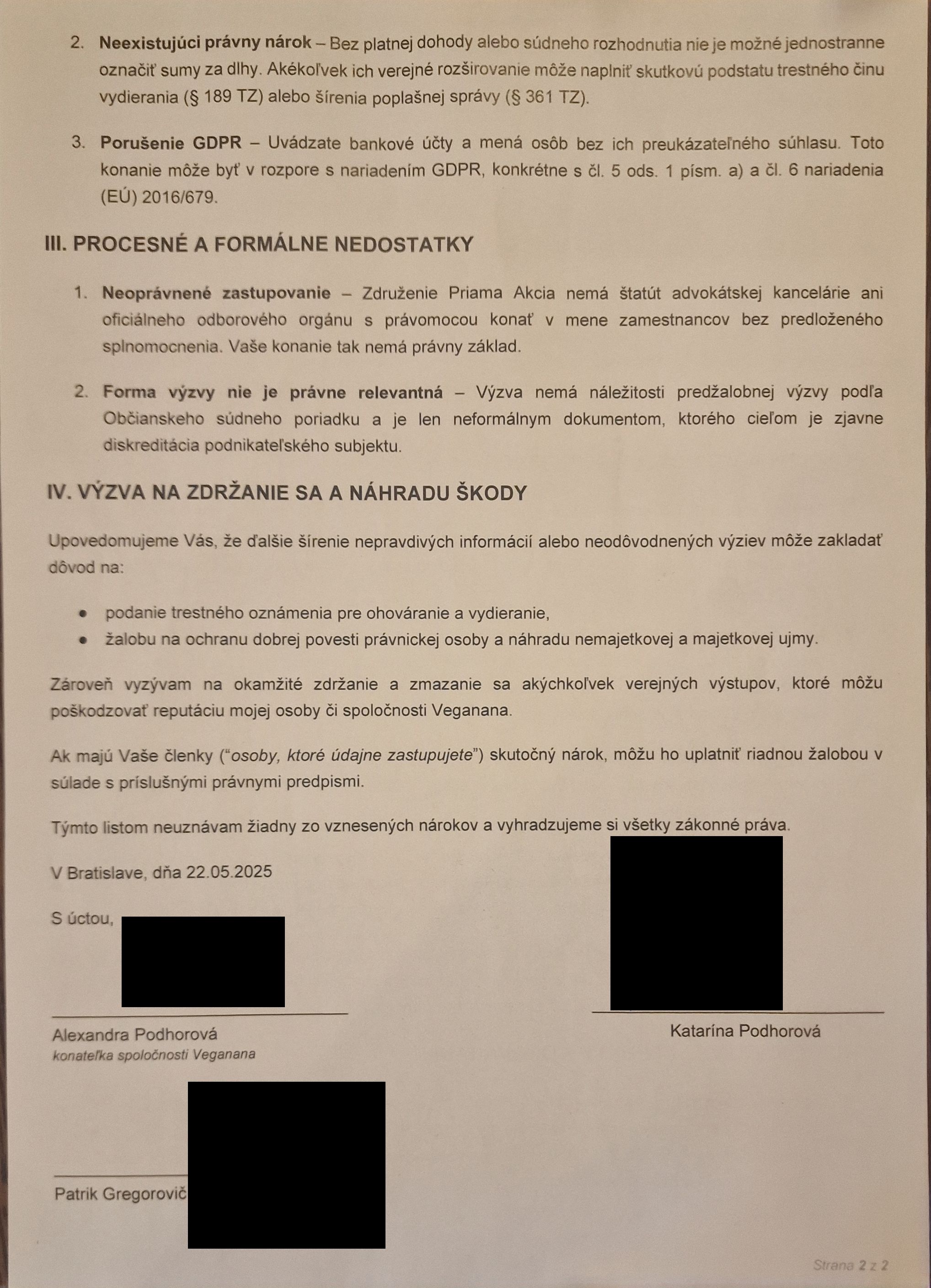 Na záver chceme dodať, že nás mrzí, že aj napriek všetkej dokumentácii, problémom v daňovej oblasti (vrátane nezmyselných výplatných pások a prevodov na účty) a nespolupráci s inšpektorátom práce, ste vo svojom liste ani po takmer desiatich mesiacoch neuznali nijaký zo vznesených nárokov a prenášate všetky pochybenia na bývalé zamestnankyne. Chápeme, že niektoré z požiadaviek bývalých zamestnankýň sa vám nepáčia, no oveľa zmysluplnejšie by podľa nás bolo o veciach komunikovať, dohodnúť sa na vyplatení dlžných miezd a spor ukončiť. Aj napriek odmietavému postoju z vašej strany preto prichádzame s ústretovým krokom – do 27. augusta 2025 pozastavujeme všetky plánované aktivity a očakávame konštruktívnu reakciu.