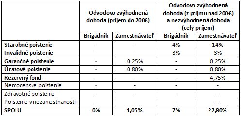 Ak brigáduješ ako študent/ka, nemusíš platiť povinné nemocenské poistenie ani poistenie v nezamestnanosti, avšak nemáš nárok na nemocenské dávky či dávky v nezamestnanosti. Garančné a úrazové poistenie, ktoré za teba odvádzal zamestnávateľ, sa bude odvádzať aj naďalej. Zamestnávateľ musí navyše platiť príspevok do rezervného fondu solidarity. Okrem toho musíš odvádzať ty aj zamestnávateľ poistné na dôchodkové poistenie (ktoré sa skladá zo starobného a invalidného poistenia).