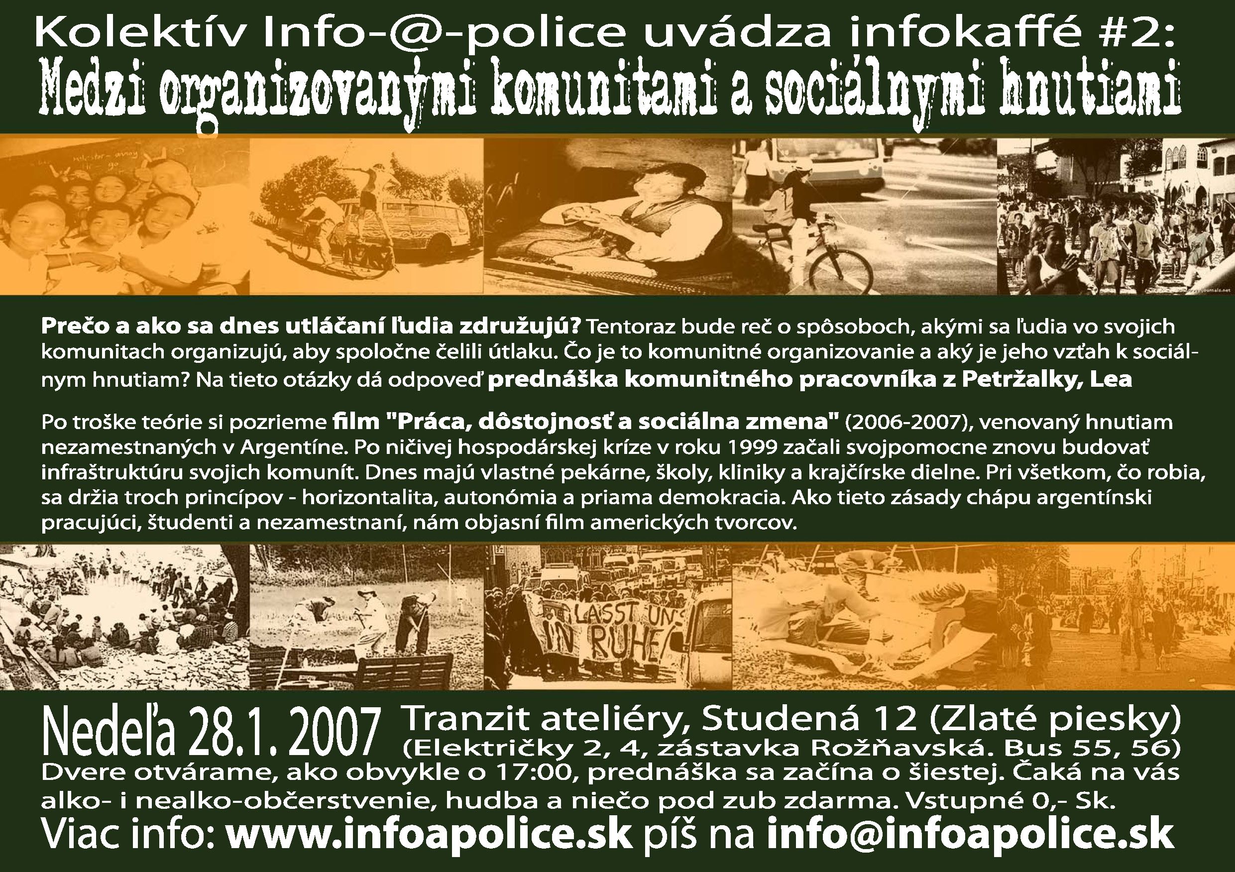 Na nedeľu 28. januára sme pripravili ďalšie infokafé. Tentoraz bude reč o spôsoboch, akými sa ľudia vo svojich komunitách organizujú, aby spoločne čelili útlaku. Čo je to komunitné organizovanie a aký je jeho vzťah k sociálnym hnutiam? Na tieto otázky dá odpoveď prednáška komunitného pracovníka z Petržalky, Lea Singera.
